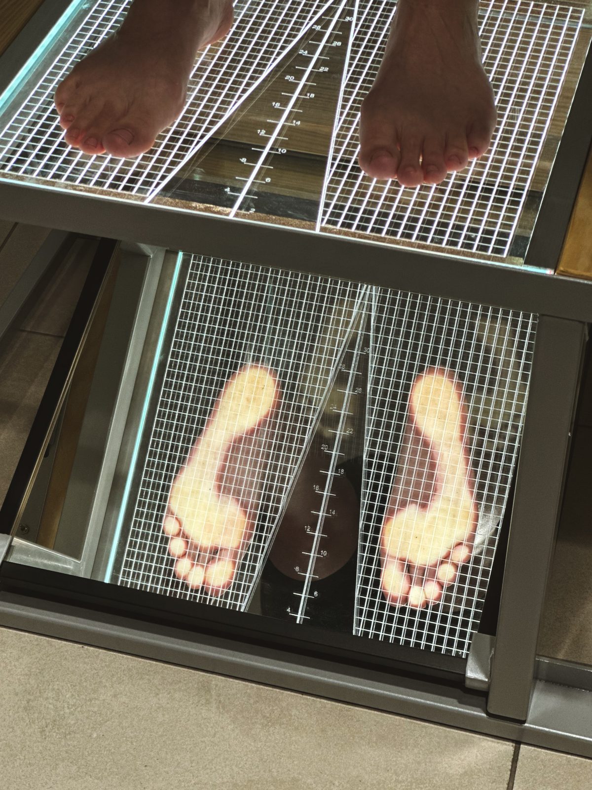 - Badanie diagnostyczne – obejmuje ocenę funkcjonalną stóp oraz kończyn dolnych, analizę chodu i postawy. Wykorzystuje się przy tym nowoczesne narzędzia diagnostyczne, w tym podoskop, który pozwala ocenić rozkład nacisku oraz ustawienie stóp w pozycji stojącej.